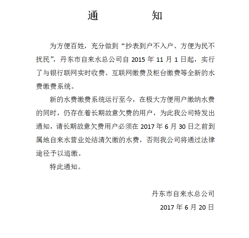丹東市自來水總公司溫馨提示2017-08-06